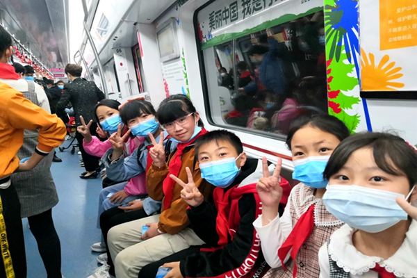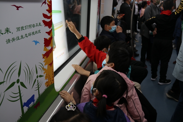 “地鐵好長,還有小電視!”從座椅到扶手,從廣告展示牌到外面忽明忽暗的風(fēng)景,都讓孩子們感到好奇,觀察著每一個角落。