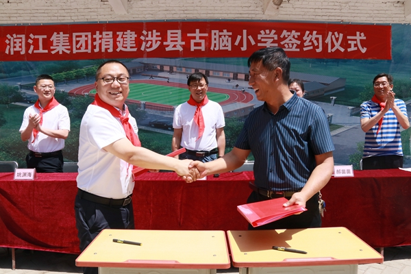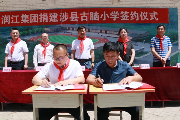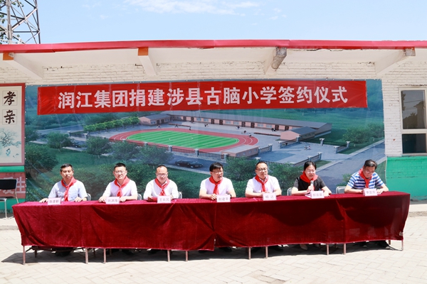 5月29日,潤江集團簽約捐建邯鄲涉縣古腦明德小學簽約儀式在學校操場舉行,龍虎鄉黨委書記趙建平、龍虎鄉政府鄉長郝苗苗、教體局黨組成員、紀檢委員姚淵海、龍虎教育集團校校長李海濤、龍虎鄉中心校校長張所平,潤江投資聯合黨支部書記楊達、河北省明德公益基金會秘書長王長風等領導和嘉賓出席了儀式。