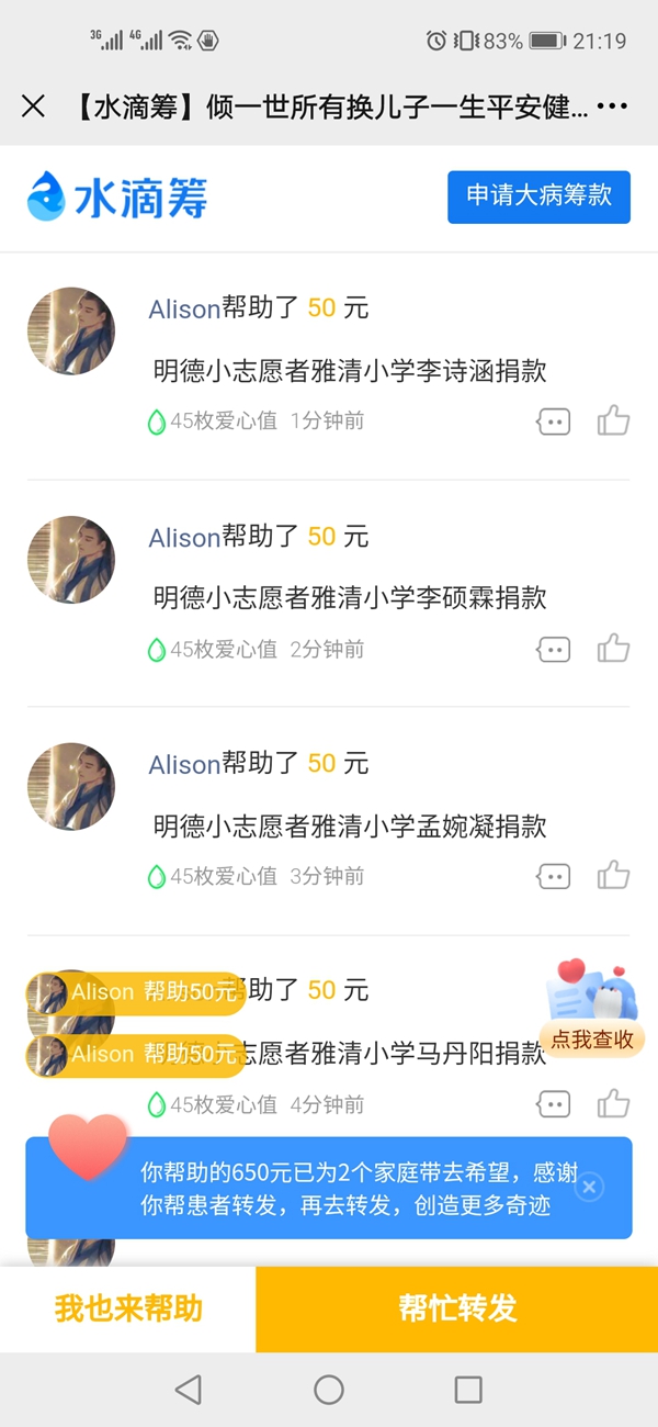 講座結束后,同學們為白血病患兒捐款500元,明德公益為孩子們頒發了捐款證書。(為保護患者隱私,詳細情況不再介紹,捐款已打入水滴籌并向學生家長公示。)