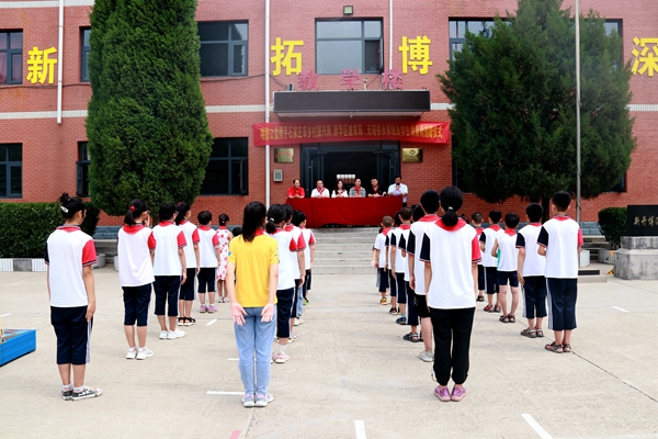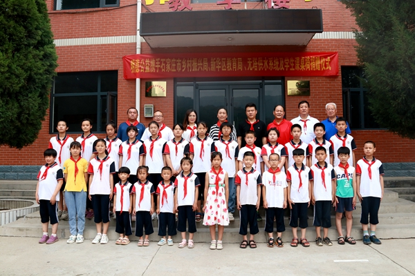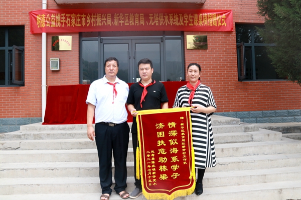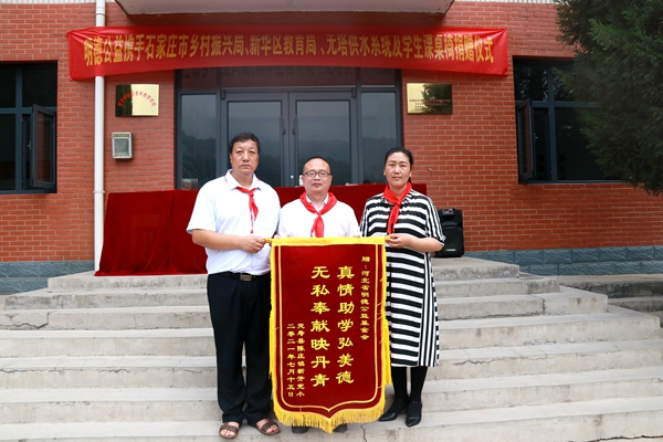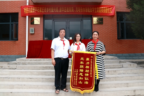 7月15日,明德公益攜手石家莊市鄉村振興局、新華區教育局,向靈壽縣陳莊鎮新開村新開完全小學捐贈價值25000多元的“無塔供水設備”和“70套學生課桌椅”儀式在學校操場舉行。新華區教育局駐新開村第一書記賈健雄、駐村干部石崗大街小學副校長韓會軍、石家莊市第十四中學團委書記楊豐碩、新華區37中支教新開完小教師李國紅、新開完小校長白麗英及部分師生出席了捐贈儀式。