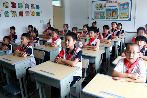 在五六年級教室,價值近10000元的70套可升降新桌椅也已投入使用。同學們為大家背誦了“弟子規”和“論語”片段。