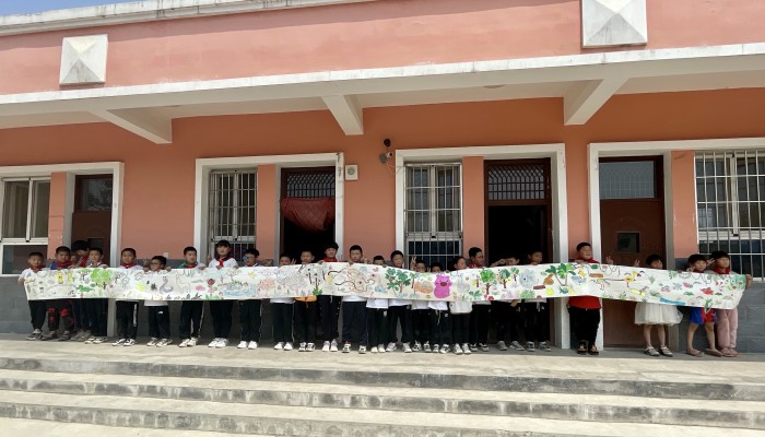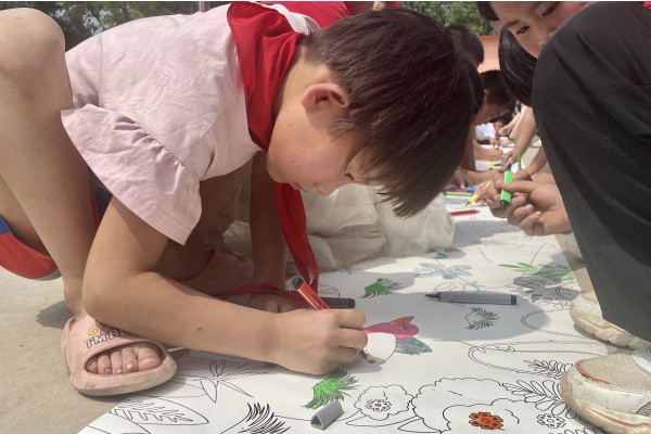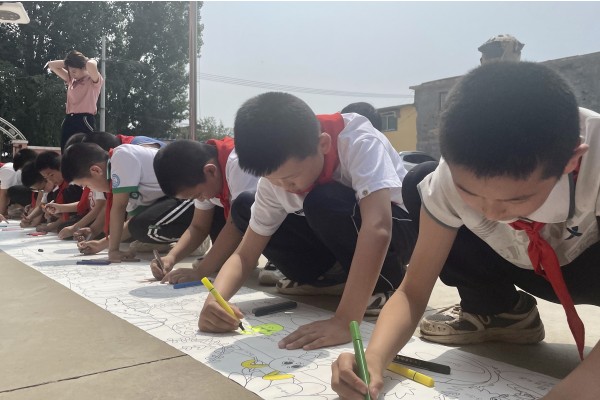 捐贈儀式結束后, 在藍天白云與操場之間,全校師生一起共同描繪長幅畫卷,經過半個多小時的集體創作,一幅充滿著孩子們對動物世界色彩暢想的畫面躍然于畫布上。