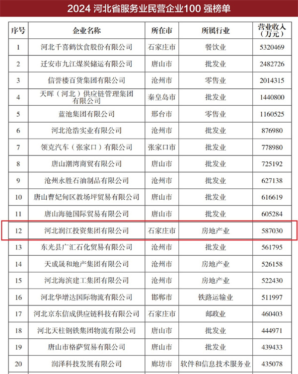 2024 河北省服務業民營企業 100 強榜單(部分排名)