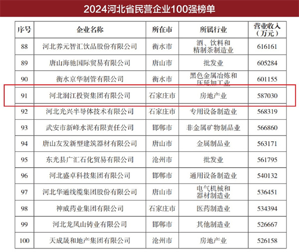 河北潤江投資集團有限公司(以下簡稱“潤江集團”)憑借健康穩健的發展態勢和過硬的綜合實力再次榮登榜單,位列“2024河北省民營企業100強”第91位、“2024河北省服務業民營企業100強”第12位,彰顯出卓越的企業品牌影響力,這也是潤江集團連續第六年榮登該榜單!