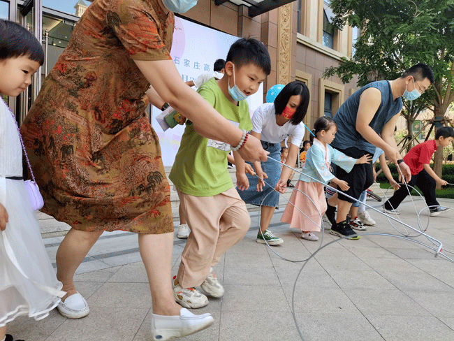 拾起遺落的散珠,串成一串記憶的鏈條。70、80年代服裝的工作人員現場為小朋友們派發年代經典小零食和懷舊玩具。伴隨著孩子們一陣陣的歡聲笑語,復古主題兒童節專場活動就這么熱鬧地開始了。滾鐵圈 、跳皮筋、打彈珠、打陀螺、跳大繩、投沙包……家長和孩子們玩的不亦樂乎,各個環節有條不紊地進行著,工作人員貼心地為獲獎者準備了小獎品。