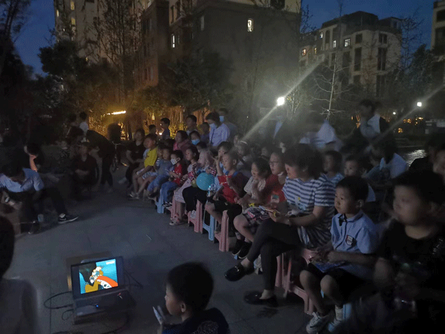 在童年放映室環節,我們為大小業主們準備了兩部口碑超贊的兒童電影《大鬧天宮》和《大魚海棠》。傍晚時分,天色暗了下來,小業主們迫不及待地搬來板凳坐到大屏幕前,重溫爸爸媽媽當年的感動,仿佛步入了不一樣的童年時光隧道。